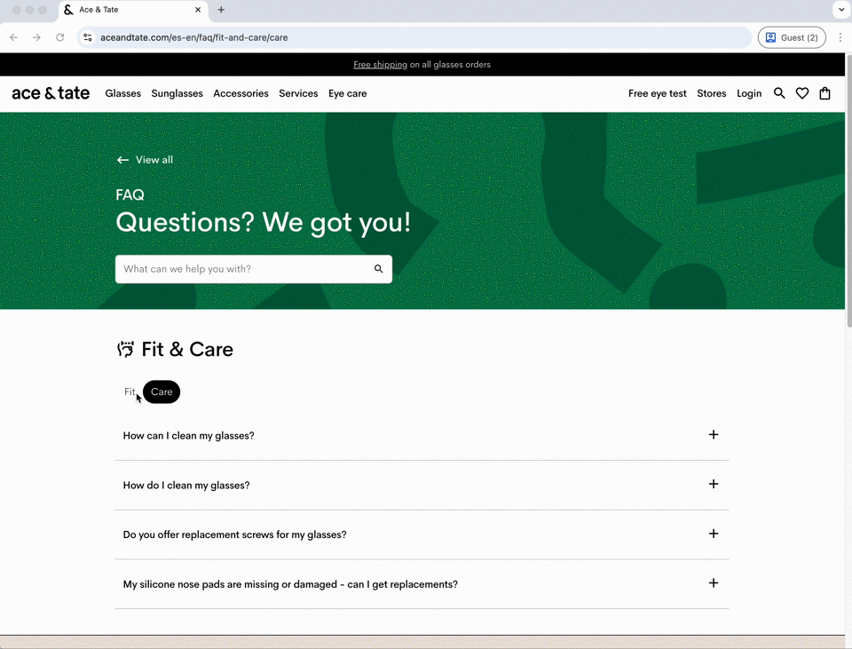 Dutch eyewear brand Ace & Tate organizes its knowledge base around how customers actually think and search, not around internal product categories. The visually engaging subcategories make browsing feel natural and intuitive.